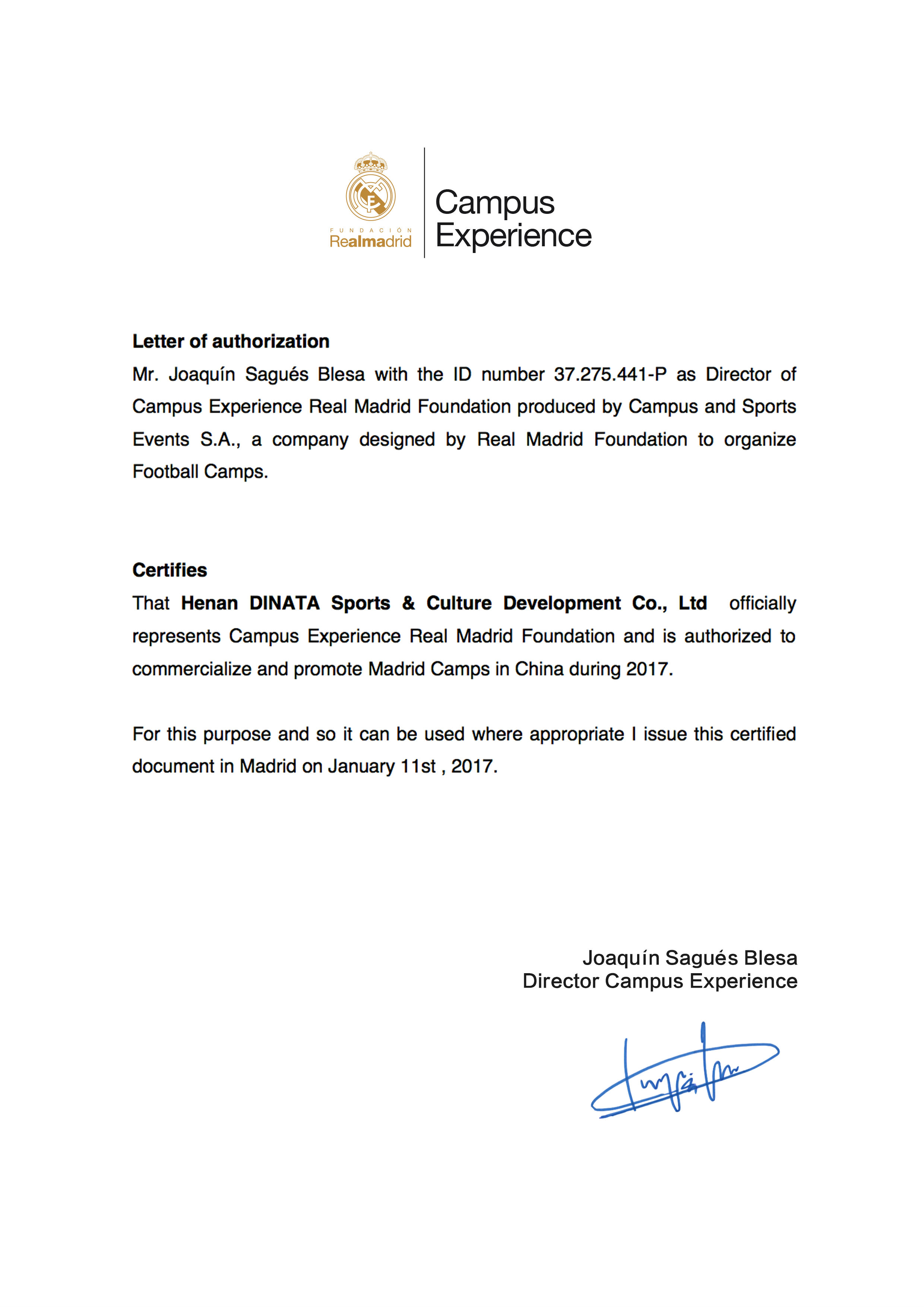 河南吉纳达体育文化发展有限公司,是经由西班牙皇家马德里俱乐部皇马基金会认定的中国区唯一官方授权机构! 授权书为法律文本,任何机构和个人未经授权不得转载或改版使用,授权内容可在皇马基金会官方查询。